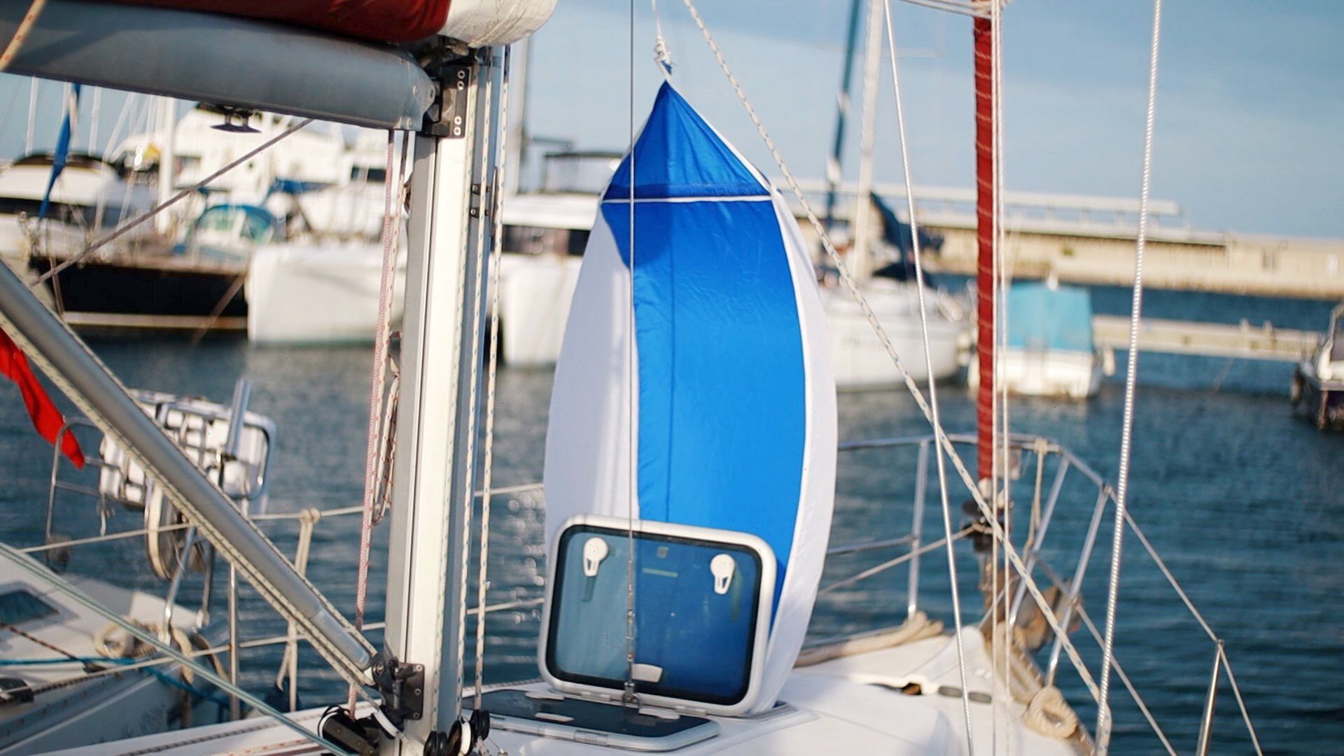 If you are on a town quay or in a marina, the bow is not always directed towards the wind and might come from different angles during the night. There is a wind scoop version that is even better than this one, but I only found out about it later in the season. That one catches the wind from all direction and also is held into place pretty smart. It’s still on the list for next season, because that one might even be better.